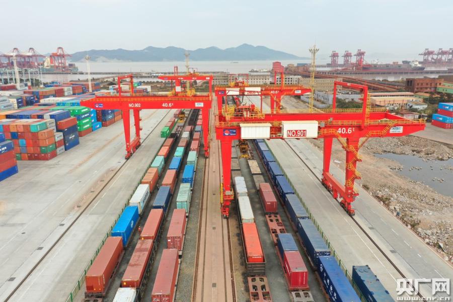 同一天,聯(lián)接“世界小商品之都”和“全球貨物吞吐量第一大港”的海鐵聯(lián)運(yùn)天天班集裝箱列車,滿載著中國小商品從義烏站駛出,經(jīng)寧波舟山港的250余條國際航線發(fā)往全球。
