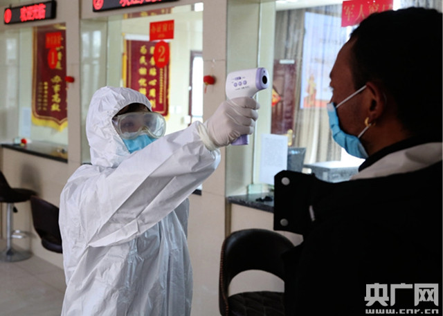 辦證室女民警正在為辦理邊境通行證群眾檢測體溫(央廣網(wǎng)發(fā) 仁青旺堆 攝)