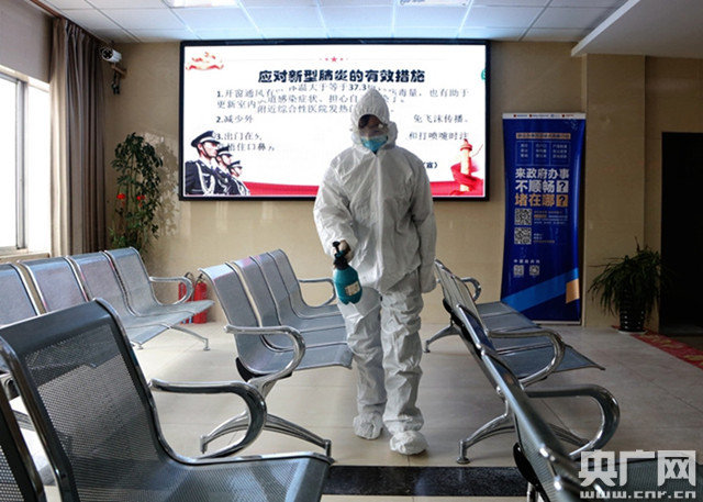 辦證室女民警正在消毒辦證大廳(央廣網(wǎng)發(fā) 仁青旺堆 攝)