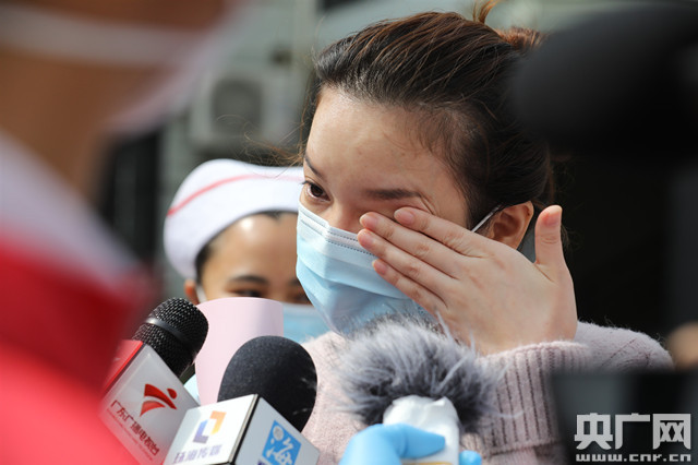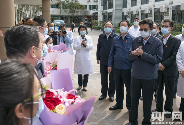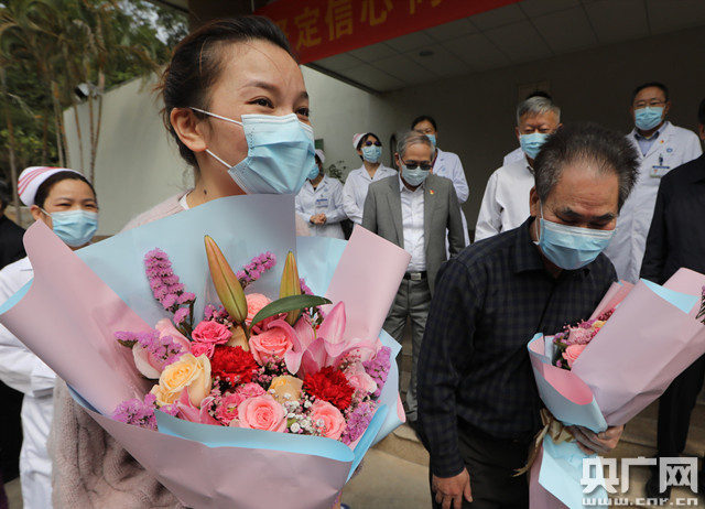上午10點30分,當(dāng)兩名患者走出病區(qū),護士代表立即送上了鮮花。34歲的女患者陸某一直在擦眼淚,另一名患者羅老伯用廣東話不停表達自己的感謝。“回去后一定要注意休息,保重好身體”,中大五院院長單鴻向他們送上祝福。