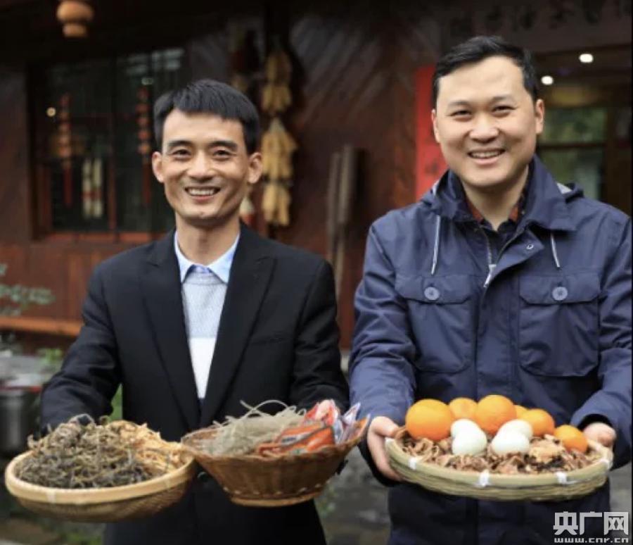 邵陽城步縣副縣長劉書軍(右)當(dāng)起“主播”推銷當(dāng)?shù)剞r(nóng)特產(chǎn)品(央廣網(wǎng)發(fā) 城步縣政府供圖)