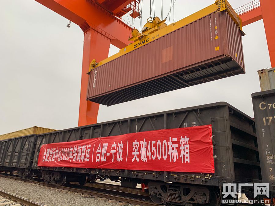 合肥貨運(yùn)中心2020年鐵海聯(lián)運(yùn)(合肥-寧波)第4500標(biāo)準(zhǔn)箱裝車(央廣網(wǎng)發(fā) 通訊員供圖)