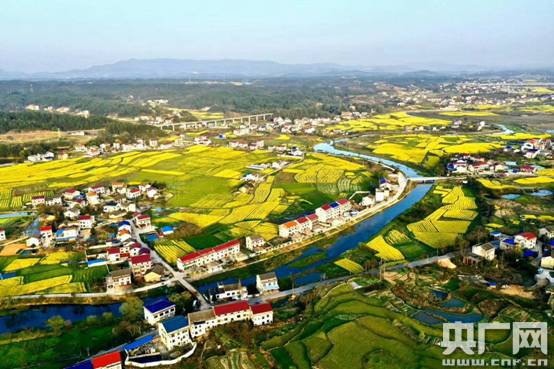 金黃的油菜花與村莊相映成趣,交織成一幅美麗清新的鄉(xiāng)村圖畫(央廣網(wǎng)發(fā) 嚴伯霖 攝)