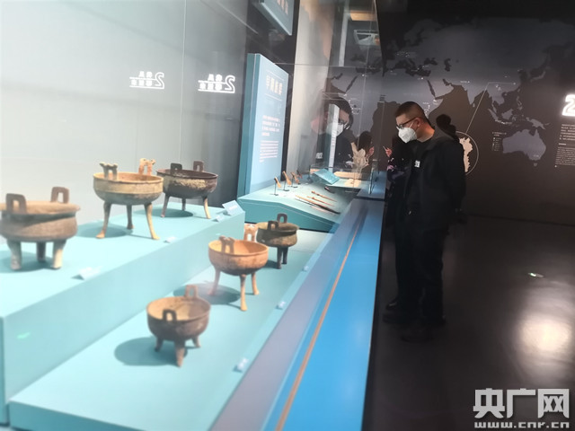 第一批預約入館的觀眾戴著口罩細細觀察展品(央廣網(wǎng)記者 姜文婧 攝)
