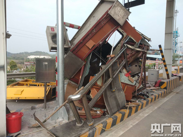巨大的沖擊力使得整個收費亭被掀翻造成散架,玻璃碎裂一地,地下的電線電纜連根拔起。員工小周當(dāng)時正在亭內(nèi)記錄過往貨車稱重數(shù)據(jù),忽然間被亭內(nèi)傾倒的設(shè)備壓住,受傷不能動彈。在貨車后面追趕的小林下意識地繼續(xù)高喊,但肇事司機曾某不予理會,加速逃離現(xiàn)場。