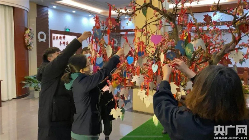 工作人員將寄語(yǔ)卡片掛在追思樹上(央廣網(wǎng)發(fā) 天津市退役軍人事務(wù)局提供)