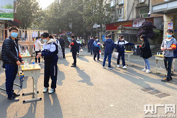學(xué)生間隔一米以上,有序進入校園(央廣網(wǎng)記者 堯遙 攝)
