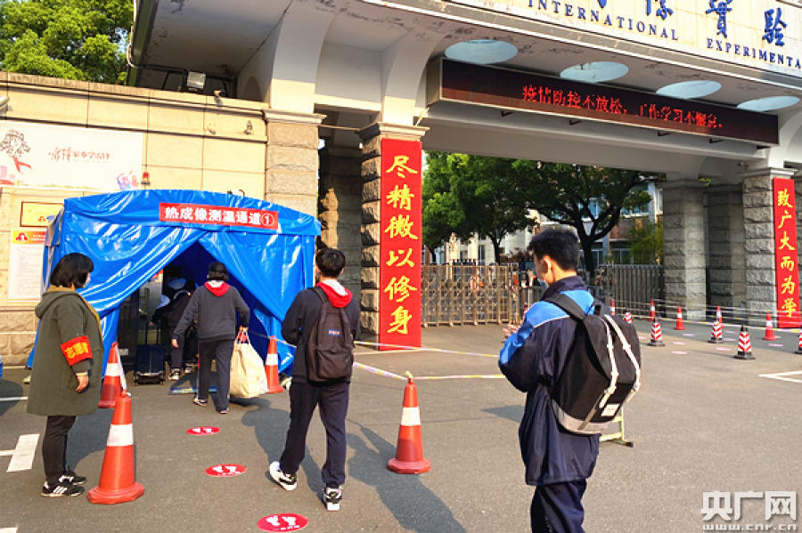 學(xué)生有序進入校門測體溫通道(央廣網(wǎng)記者 堯遙 攝)
