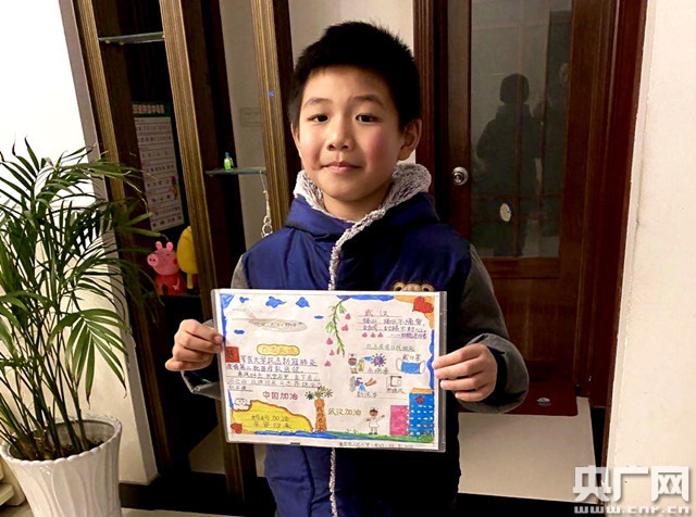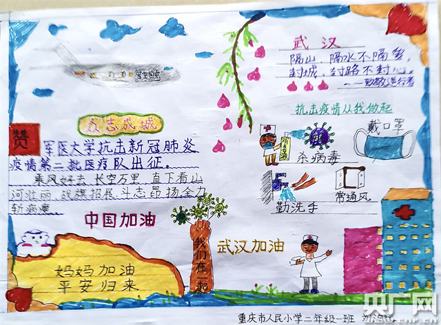 在媽媽武漢抗疫期間,兒子劉泊遠(yuǎn)堅(jiān)持每天與媽媽視頻連線,告訴外婆宅在家里發(fā)明的新菜式,匯報(bào)每天學(xué)習(xí)的內(nèi)容,與媽媽分享寫的稚嫩的日記。在李莎莎馳援武漢一周的時(shí)候,兒子將一幅親手繪制的畫報(bào)送給媽媽,畫報(bào)中有媽媽到武漢搭乘的“胖妞”大飛機(jī),有媽媽穿防護(hù)服在一線戰(zhàn)斗的樣子,也有新型冠狀病毒被消滅的樣子,并且還不忘提醒大家勤洗手、戴口罩,特別是還在畫報(bào)中寫到:媽媽加油,平安歸來!