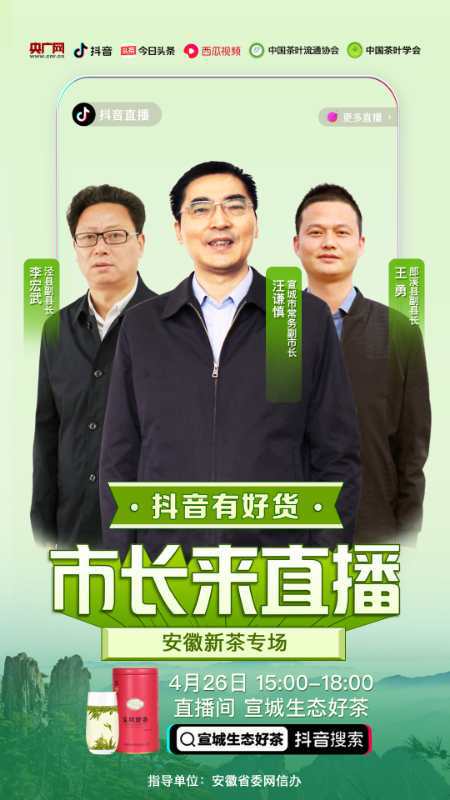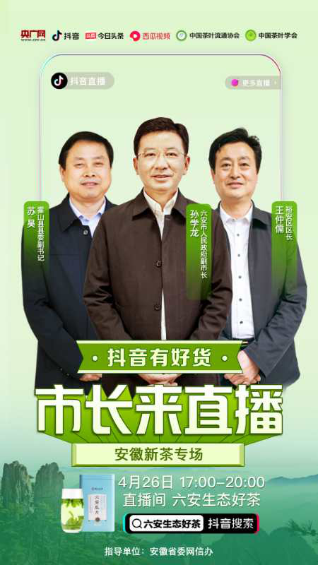 央廣網(wǎng)合肥4月24日消息(記者 張宣劍)當(dāng)前,安徽各地正值春茶上市銷售的黃金期。為充分運用銷售直播手段,幫助茶農(nóng)迅速打開銷路,解決農(nóng)產(chǎn)品賣難問題,讓好產(chǎn)品賣出好價格,讓網(wǎng)民買到好產(chǎn)品,讓更多安徽特色優(yōu)質(zhì)農(nóng)產(chǎn)品乘上數(shù)字經(jīng)濟、新型消費的“快車道”,安徽省委網(wǎng)信辦將聯(lián)合抖音、央廣網(wǎng)等平臺,在安徽茶葉主產(chǎn)區(qū)——六安、黃山、宣城市,舉辦茶葉專場網(wǎng)上銷售直播活動,以直播帶貨方式,向網(wǎng)民推介安徽特色好茶。