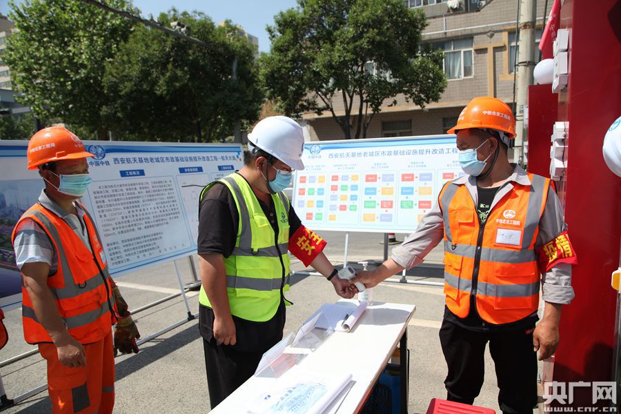 5月1日,西安市華美十字路口附近中鐵北京工程局集團(tuán)一公司承建的西安航天基地市政提升改造項(xiàng)目城市架空線纜落地施工現(xiàn)場,對建筑工人進(jìn)場施工前進(jìn)行測體溫、健康登記等(央廣網(wǎng)記者 舒隆煥 攝)