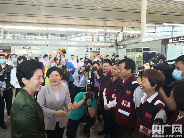 湖南省委副書記烏蘭、湖南省副省長吳桂英一行在機場為專家組送行,祝愿平安歸來(央廣網(wǎng)記者 姜文婧 攝)