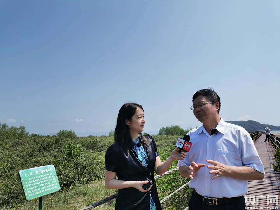 在廣東海陵島紅樹林國家濕地公園,陽江市自然資源局黨組成員、副局長葉試向總臺央廣記者介紹紅樹林保護情況(央廣網(wǎng)發(fā) 黃華坤 攝)