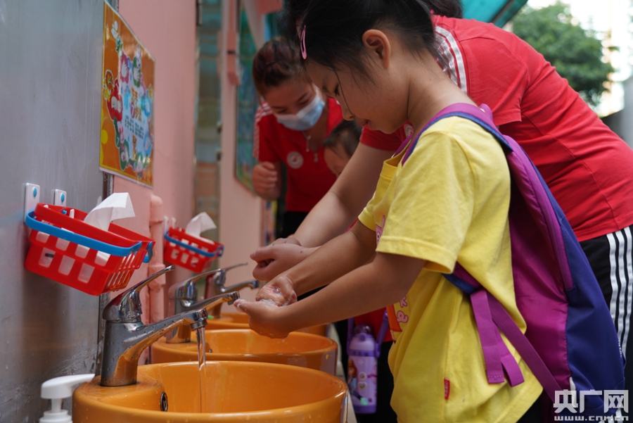 △為孩子講解如何正確洗手(央廣記者 鄭澍 攝)