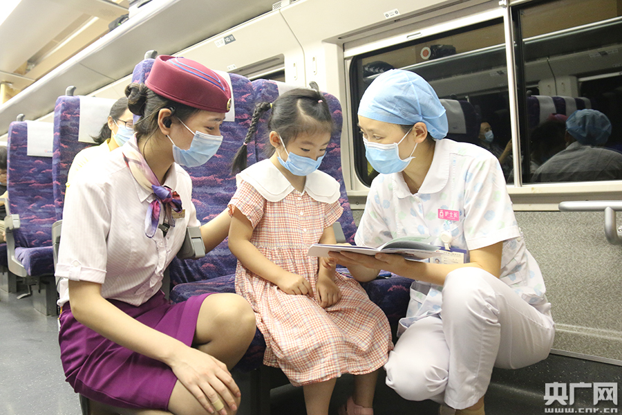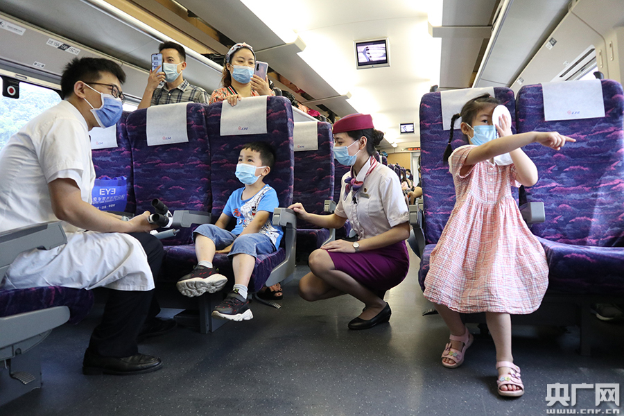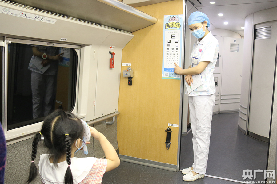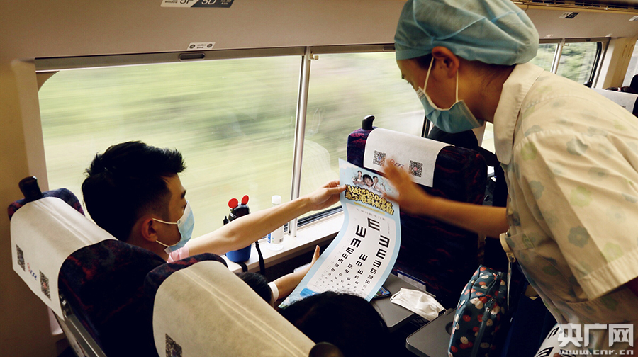 列車乘務(wù)員和醫(yī)生、護(hù)士長一起和小旅客宣傳保護(hù)眼睛的方法(央廣網(wǎng)發(fā) 通訊員供圖)