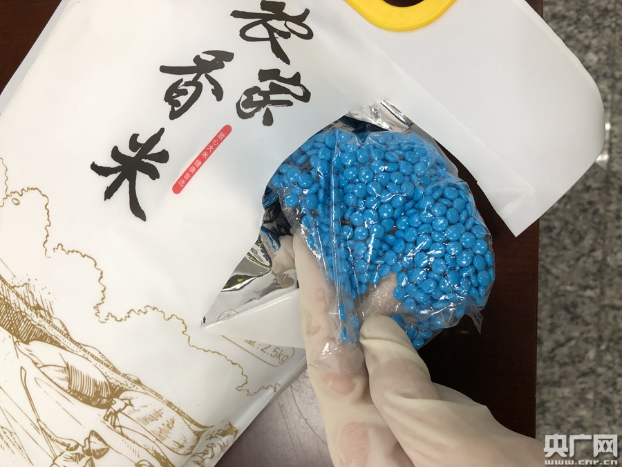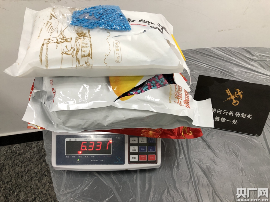 廣州海關(guān)所屬廣州白云機(jī)場海關(guān)關(guān)員查獲旅客違規(guī)攜帶偽裝成“香米”的藥品進(jìn)境(央廣網(wǎng)發(fā) 呂依 攝)