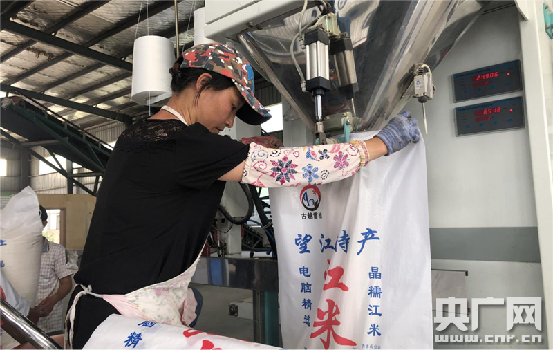 工人正在袋裝剛剛加工好的大米。(央廣網(wǎng)記者 徐鵬 攝)