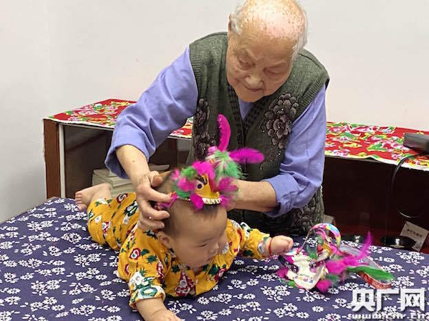 姚老給村里的孩子戴上“老虎帽”,祝愿小孩健康成長的寓意(央廣網(wǎng)發(fā) 徐家輝 攝)