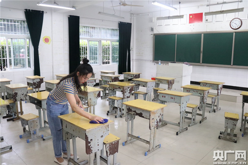 工作人員正在考場(chǎng)內(nèi)用消毒水擦拭桌面。(央廣網(wǎng)記者徐鵬 趙家慧 攝)