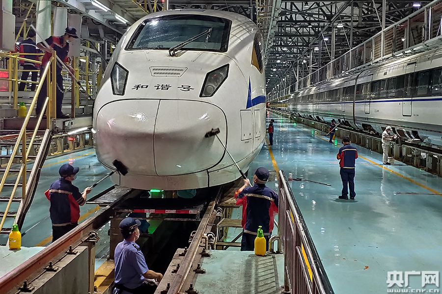 保潔人員正在對(duì)動(dòng)車(chē)組頭燈和司機(jī)室擋風(fēng)玻璃進(jìn)行清潔(央廣網(wǎng)發(fā) 通訊員馬明晶 攝)