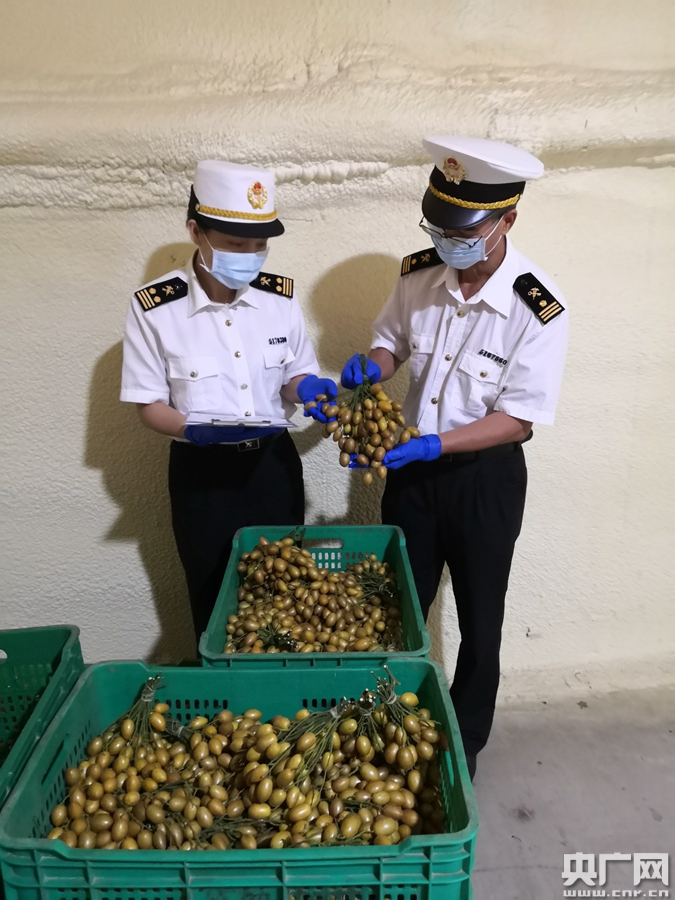 廣州海關(guān)所屬佛山海關(guān)駐高明辦事處關(guān)員對(duì)出口黃皮進(jìn)行查驗(yàn)(央廣網(wǎng)發(fā) 張永瑜 攝)