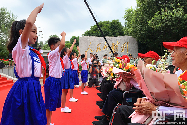 少先隊員向抗戰(zhàn)老兵敬獻鮮花(央廣網(wǎng)發(fā) 覃昆 攝)