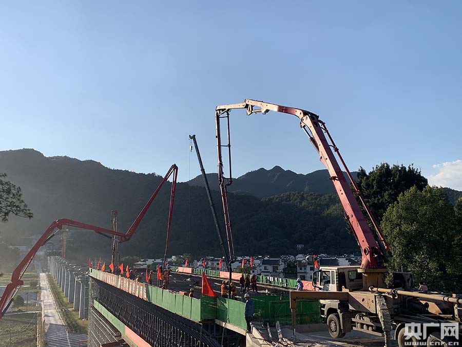 休寧河特大橋位于安徽省休寧縣境內(nèi),是昌景黃鐵路全線重要控制性工程之一。此次施工的橋梁上跨205國道,梁面跨度64米、寬12.6米,是目前國內(nèi)在建最大跨度高速鐵路現(xiàn)澆簡支梁。
