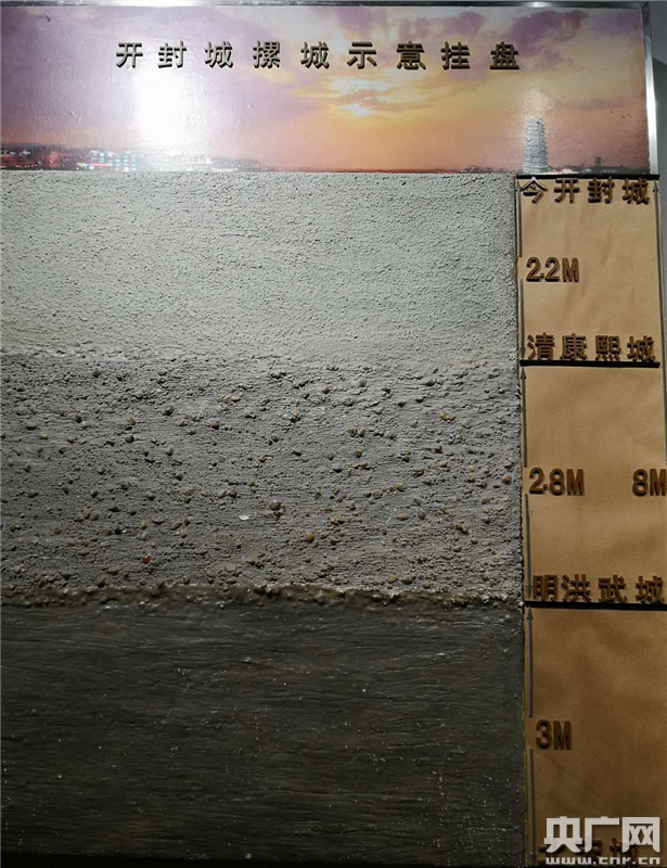 《開(kāi)封城摞城示意掛盤(pán)》,我們可以清楚地看到古城開(kāi)封城下的三座城池,3米以下的北宋城,2.8米以下的明洪武城,2.2米以下的清康熙城(今開(kāi)封城)。(總臺(tái)央廣記者 任磊萍 攝)
