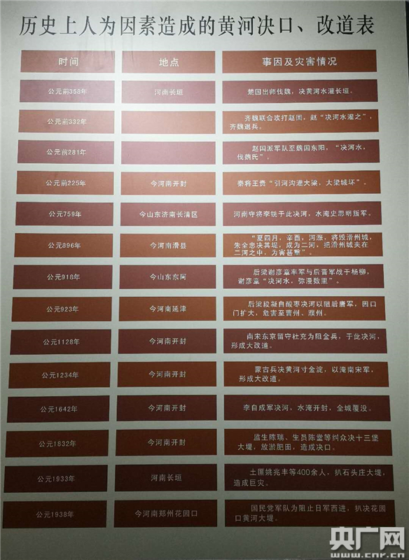 《歷史上人為因素造成的黃河決口、改道表》, 自先秦至民國(guó)的近3000年間,黃河平均“三年兩決口,百年一改道”。明代和清代尤其嚴(yán)重!暗拦舛,洪水漲上天。沖走太陽(yáng)渡,捎帶萬(wàn)錦灘!边@首陜縣民謠,形象反映了清朝道光年間黃河水泛濫成災(zāi)的現(xiàn)象。(總臺(tái)央廣記者 任磊萍 攝)