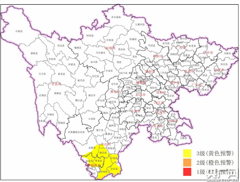 預(yù)警區(qū)域為攀枝花米易縣、鹽邊縣、仁和區(qū),涼山州西昌市、鹽源縣、德昌縣、會理縣、會東縣、寧南縣、普格縣、布拖縣。