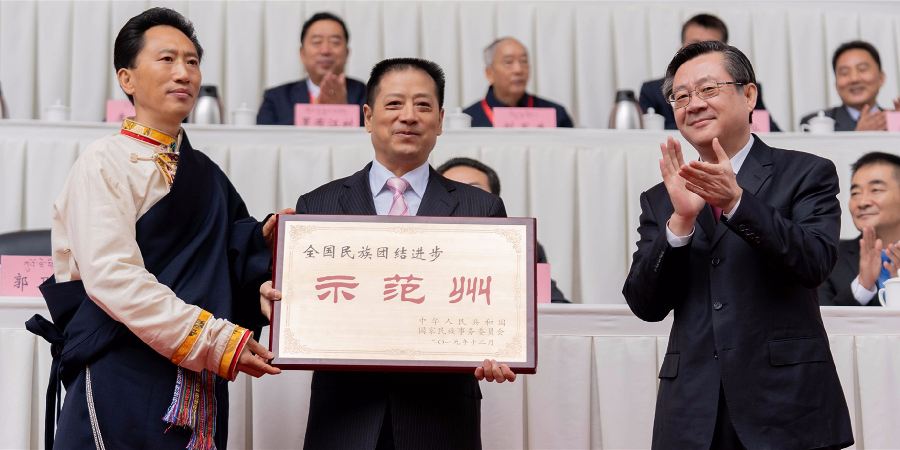 “全國(guó)民族團(tuán)結(jié)進(jìn)步示范州”授牌(央廣網(wǎng)發(fā) 甘孜州委宣傳部供圖)