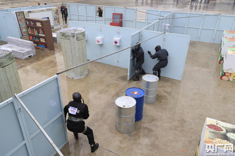賽場即戰(zhàn)場,對抗硝煙濃。突擊攻堅武力抗壓推進比賽采取全真情景設(shè)置,所在場地為20×14米,模擬實戰(zhàn)環(huán)境下的糧油、倉庫、菜市場、賓館接待大廳和臥室房間等4個不同場景下的抗壓武力推進,旨在考驗每名特警隊員的戰(zhàn)術(shù)素養(yǎng)。所有參賽隊伍需要研究制定多套戰(zhàn)術(shù)推進方案,合理分配小組成員分工,在15分鐘內(nèi)完成任務(wù)。參戰(zhàn)特警隊員合理利用有效掩體物,配合嫻熟技戰(zhàn)動作和戰(zhàn)術(shù)手語,在火力狙擊手的威脅下,運用攻防戰(zhàn)術(shù),躲避危險火力點打擊,運用最短的時間快速清除威脅。槍響靶落,彈無虛發(fā),真槍實彈的逼真比賽現(xiàn)場,全面檢驗特警隊員“突得進、打得贏、救得出”的戰(zhàn)術(shù)理念,展現(xiàn)了山東公安特巡警隊伍“首戰(zhàn)用我、敢打必勝”的過硬素質(zhì)。
