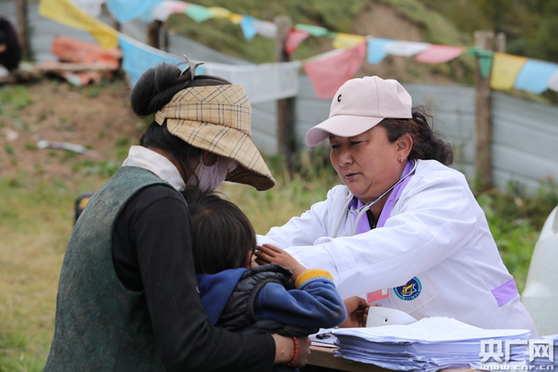 扎西白珍醫(yī)生為村民看。ㄖ醒霃V播電視總臺(tái)央廣記者 普布次仁 攝)
