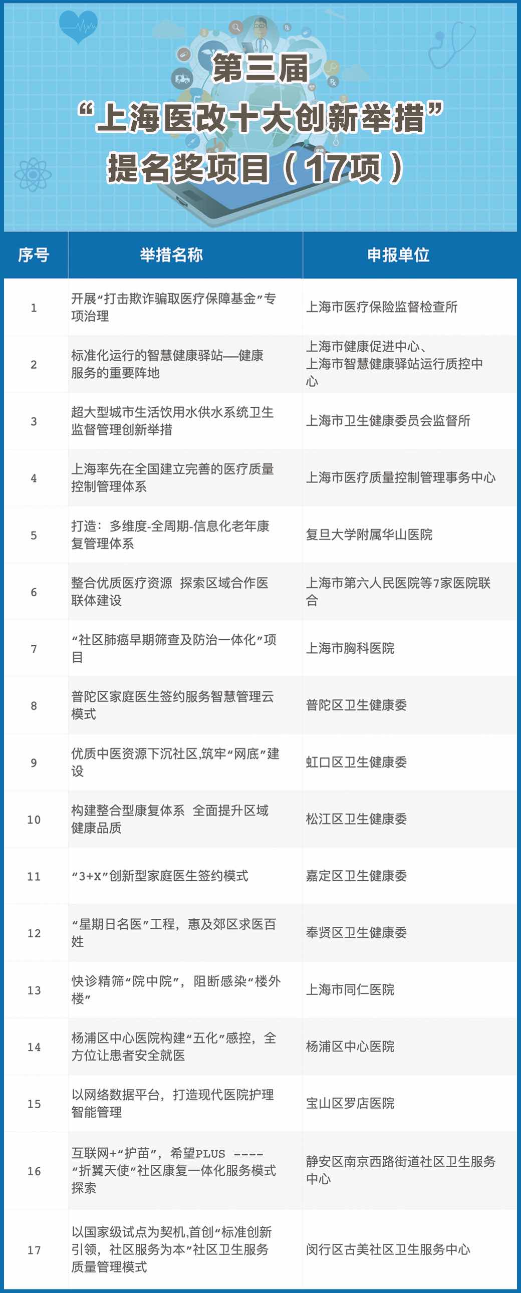 今年的評選活動正值抗疫期間,但社會反響依舊熱烈,共收到辦醫(yī)主體、醫(yī)療衛(wèi)生機構(gòu)和市級衛(wèi)生計生相關(guān)學(xué)會(協(xié)會)等推薦申報的58條舉措。經(jīng)過專家嚴(yán)格遴選,產(chǎn)生了27條入圍舉措,并通過“健康上海12320”官方微信接受市民投票。日前,第三屆“上海醫(yī)改十大創(chuàng)新舉措”評選結(jié)果正式出爐,現(xiàn)向社會公布。這些獲獎、入圍舉措引起社會強烈反響,全方位展示了上海醫(yī)改的突破性進(jìn)展和積極成效,為上海、長三角乃至全國居民就醫(yī)帶來了實實在在的獲得感、幸福感。