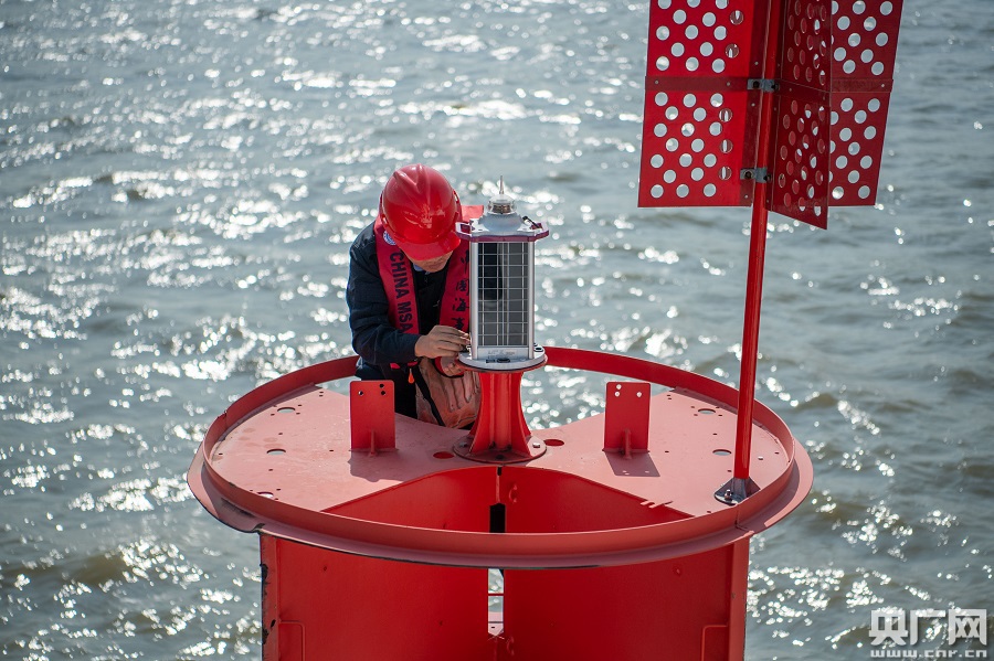 交通運(yùn)輸部東海航海保障中心上海航標(biāo)處今天完成吳淞口警戒區(qū)水域103號(hào)燈浮新型國(guó)產(chǎn)北斗遙測(cè)終端安裝(央廣網(wǎng)發(fā) 上海航標(biāo)處供圖)