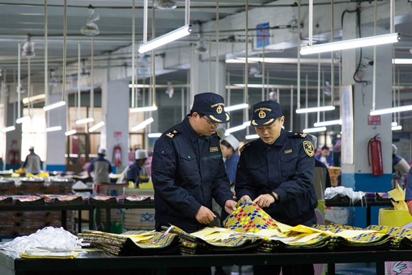濟(jì)南海關(guān)工作人員正在查看出口非洲的蠟印布生產(chǎn)情況(央廣網(wǎng)發(fā) 鄭保國(guó)攝)