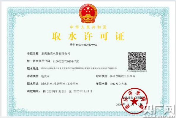 央廣網重慶11月3日消息(記者陳鵬)記者從重慶市水利局獲悉,11月2日,重慶市水利局向重慶渝榮水務有限公司頒發(fā)取水許可電子證照,該電子證照是重慶市向取水單位頒發(fā)的首張取水許可電子證照,標志著重慶市網上辦事大廳“渝快辦”實現了取水許可審批政務服務“一網通辦”。