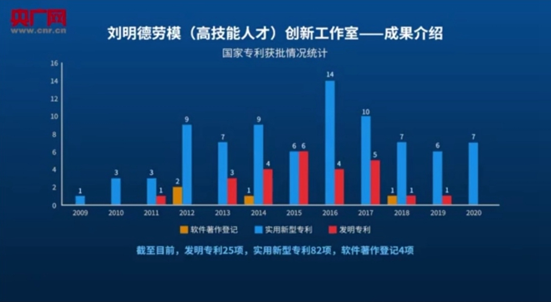 2016年8月,“劉明德勞模(高技能人才)創(chuàng)新工作室”成立,迄今累計(jì)獲得111項(xiàng)國(guó)家專利。