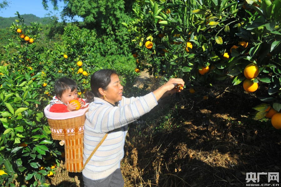 在江西省贛州市全南縣南逕鎮(zhèn)三峽移民新村蔡祖富的臍橙園,一家三口人高興地開始采摘臍橙(央廣網發(fā) 通訊員供圖)