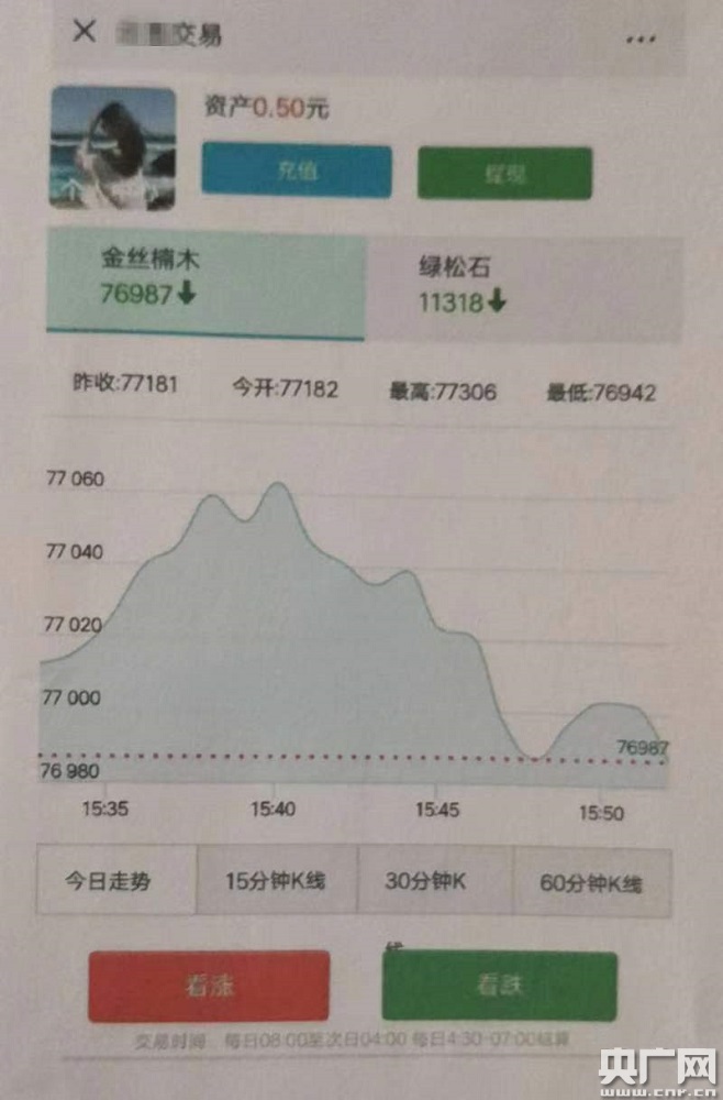 央廣網(wǎng)重慶11月12日消息(記者陳鵬)進(jìn)入專門的“交易市場”,預(yù)估金絲楠木、綠松石、天麻、藏紅花、天然橡膠、澳洲紅酒、松茸等“商品”的漲跌,預(yù)測準(zhǔn)確則可獲利。這種高大上的“金融游戲”,吸引了大量網(wǎng)友入坑。而實(shí)際上,所謂的“市場”只是一位程序員編寫的小程序,漲跌全是人為操作。
