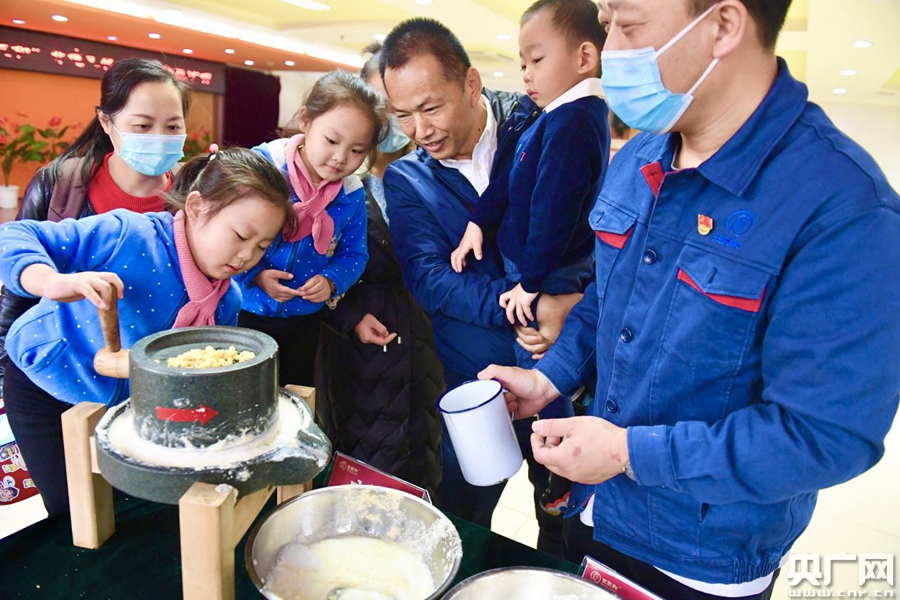 圖為老字號王致和非遺文化進社區(qū)公益活動,小朋友在體驗腐乳釀造技藝“磨豆”工序。(央廣網(wǎng)發(fā))