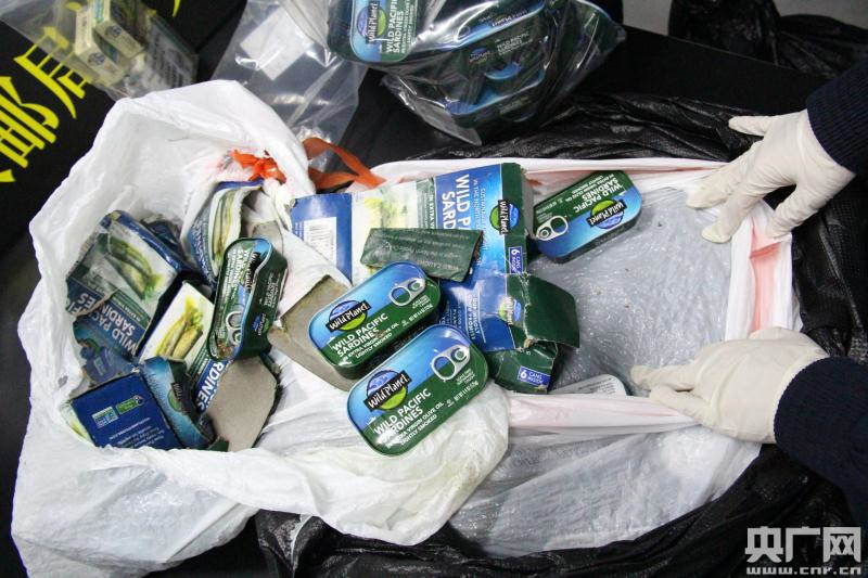 重慶海關(guān)所屬郵局海關(guān)查獲的“長蟲”的罐頭(央廣網(wǎng)發(fā) 重慶海關(guān)供圖)