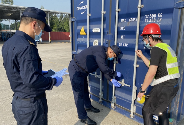 圖為廣州海關(guān)所屬佛山海關(guān)駐三水辦事處關(guān)員對退運固體廢物進(jìn)行核對箱體和加封海關(guān)關(guān)封 (央廣網(wǎng)發(fā) 賴玨冰攝)