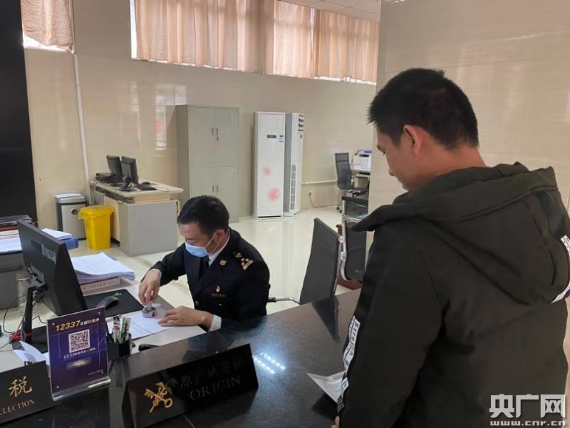 河口海關關員對打印完成的原產(chǎn)地證書加蓋印章(央廣網(wǎng)發(fā) 畢然供圖)