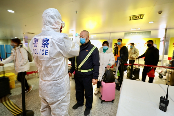 機場公安民警正在對旅客進行測溫(央廣網(wǎng)發(fā) 甘肅省公安廳供圖)