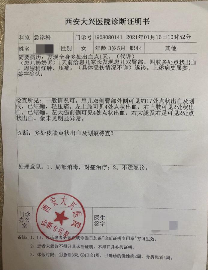 1月15日,西安市民楊女士發(fā)現(xiàn)3歲的女兒腰部、膝蓋上有多處出血點(diǎn)。1月16日,楊女士帶女兒到醫(yī)院檢查,醫(yī)院診斷報(bào)告上顯示,患兒雙臀、上肢、大腿點(diǎn)狀出血共有29處。西安大興醫(yī)院診斷證明上顯示,患兒雙側(cè)臀部外側(cè)可見(jiàn)約17處點(diǎn)狀出血及劃痕,已結(jié)痂,輕壓痛。左上肢可見(jiàn)4處點(diǎn)狀出血,右上肢可見(jiàn)2處狀出血,已結(jié)痂。左大腿前側(cè)可見(jiàn)4處點(diǎn)狀出血,右大腿及右足可見(jiàn)2處點(diǎn)狀出血。診斷結(jié)果為:多處皮膚點(diǎn)狀出血及劃痕待查?