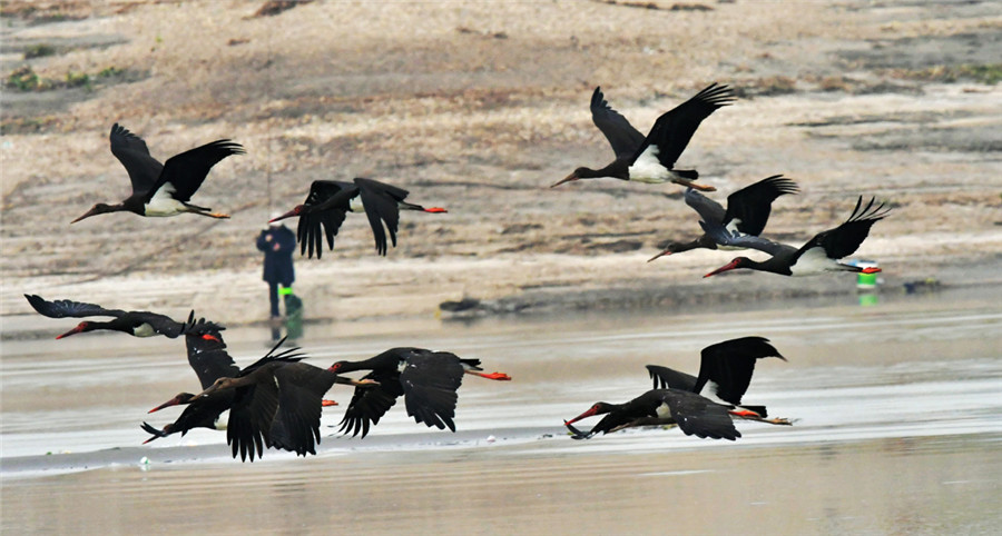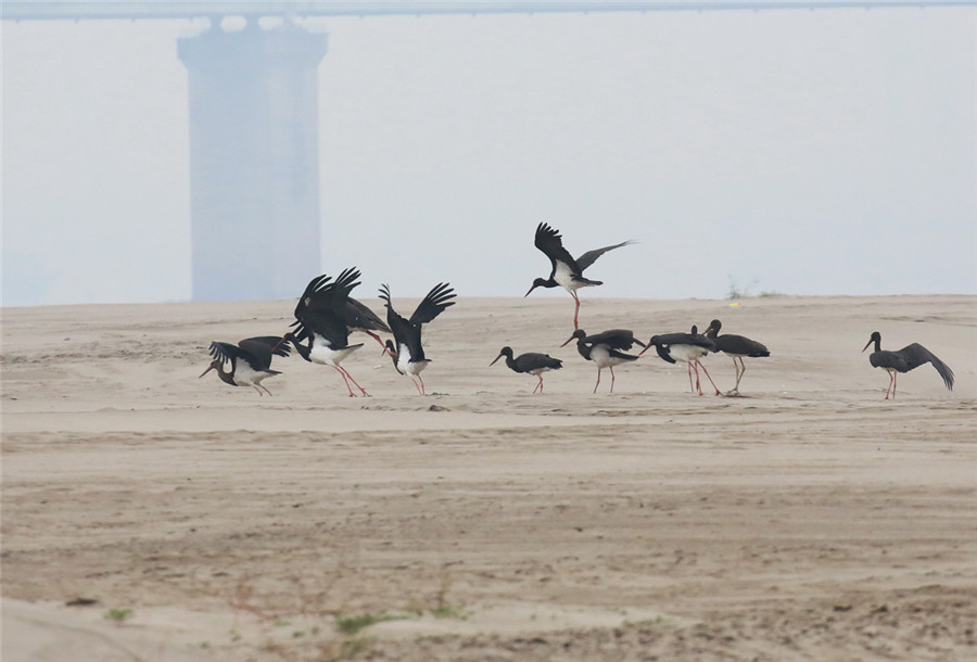 黑鸛種群在武漢天興洲越冬棲息(央廣網(wǎng)發(fā) 武漢市觀鳥協(xié)會(huì)供圖)