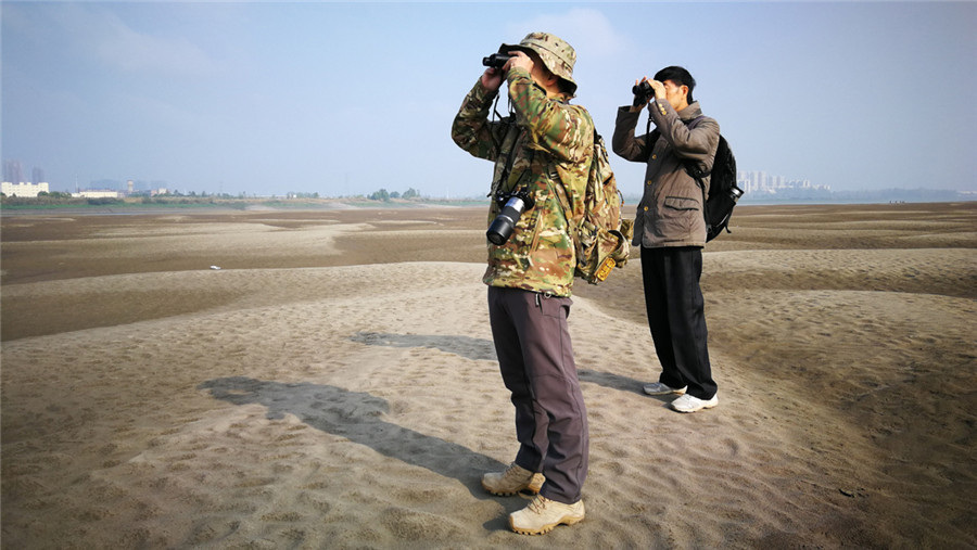 志愿者在洲頭沙灘開展黑鸛保護(hù)巡護(hù)(央廣網(wǎng)發(fā) 武漢市觀鳥協(xié)會(huì)供圖)