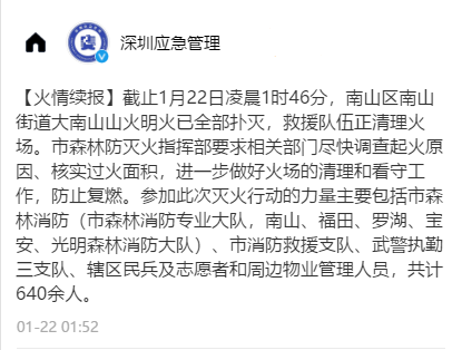 深圳市南山區(qū)大南山于1月21日20時(shí)20分突發(fā)山火,全市共派出救火人員共計(jì)640人,此次大火無(wú)人員傷亡,無(wú)重要設(shè)施受影響。