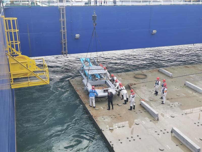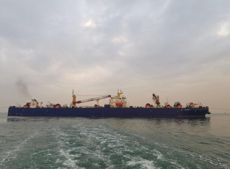 世界首制沉管浮運(yùn)安裝一體船提帶E7管節(jié)前往沉放隧址 通訊員供圖